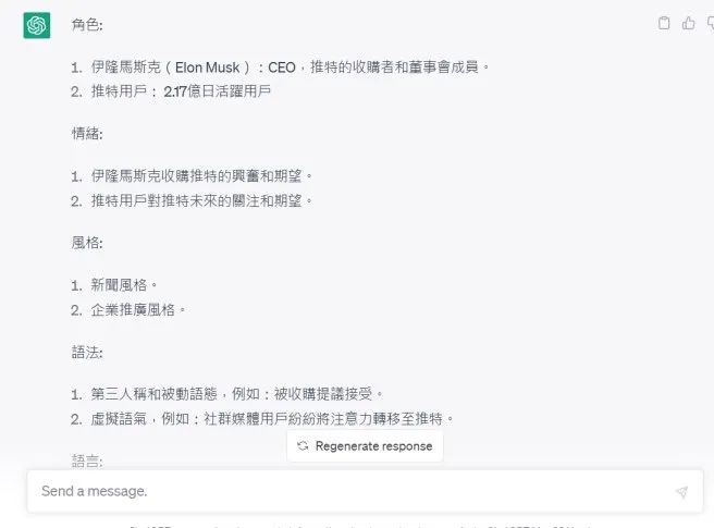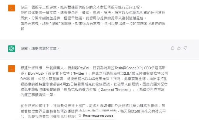 我将Prompt提示翻成中文,转达给Chat GPT,再来粘贴我自己写的文章”马斯克重金收购推特6个方法跟风打造社群经济商机”请Chat GPT来做出Prompt,方便接下来生成另一篇新文章: