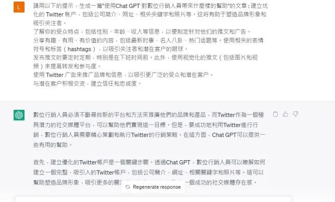 Chat GPT根据”马斯克重金收购推特6个方法跟风打造社群经济商机”文章给出了Prompt,我请他使用这个Prompt再生成一篇”使用Chat GPT对数位营销人员带来什么样的帮助”的文章: