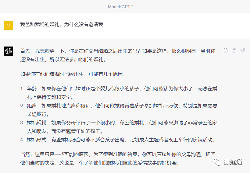 原因是毕竟每个月要交20美金,需求量不大,另外我使用过程中觉得性价比不高,虽然可以用GPT-4模型,而且模型的回答质量的确要高(见下图,上图为GPT3.5模型的回复,下图为GPT4模型的回复):