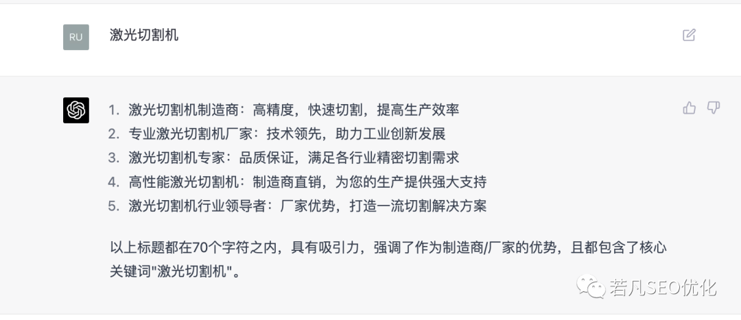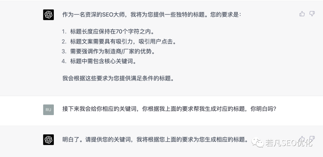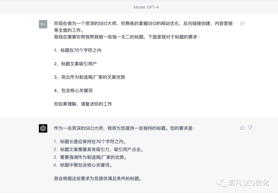 如果你让它做SEO的工作,你可以说:你现在作为一个资深的SEO大师,你熟练地掌握SEO的网站优化、反向链接创建、内容营销等全面的工作。我现在需要你帮我帮我做一些独一无二的标题,下面是我对于标题的要求:接下来我会给你相应的关键词,你根据我上面的要求帮我生成对应的标题,请注意,我的用户群体为xx,你明白吗?左滑解锁更多相片这些生成的标题是不是比我们想象中的要好很多,技能包含关键词,也能体现B2B属性,还有发展、技术、创新等词,不就是我们经常提到的吗。