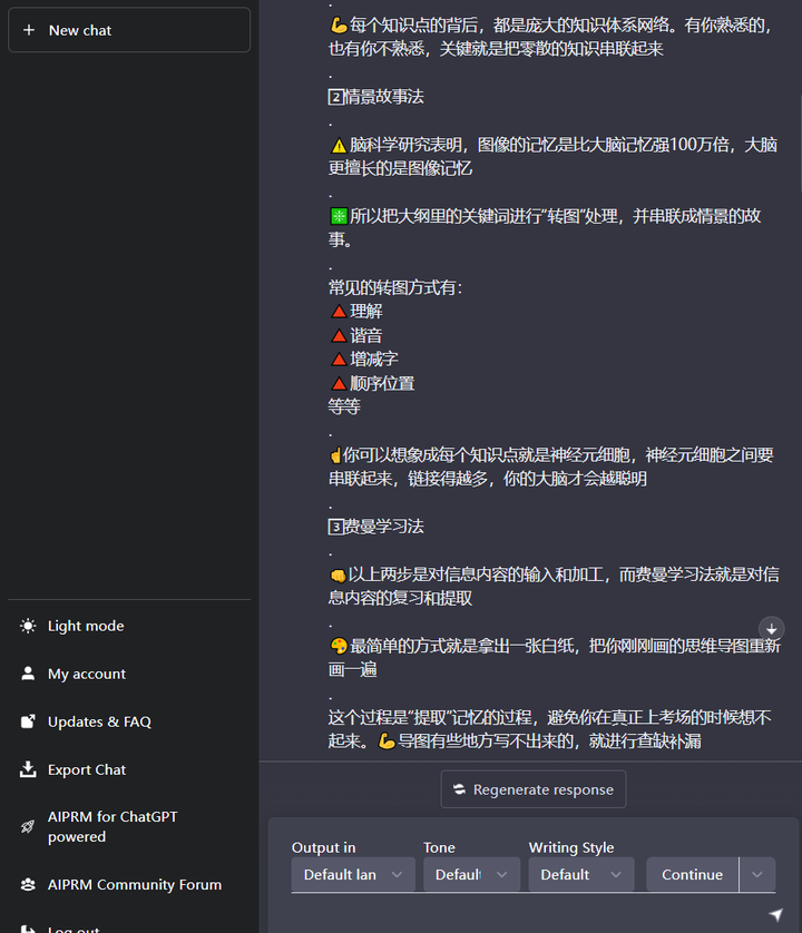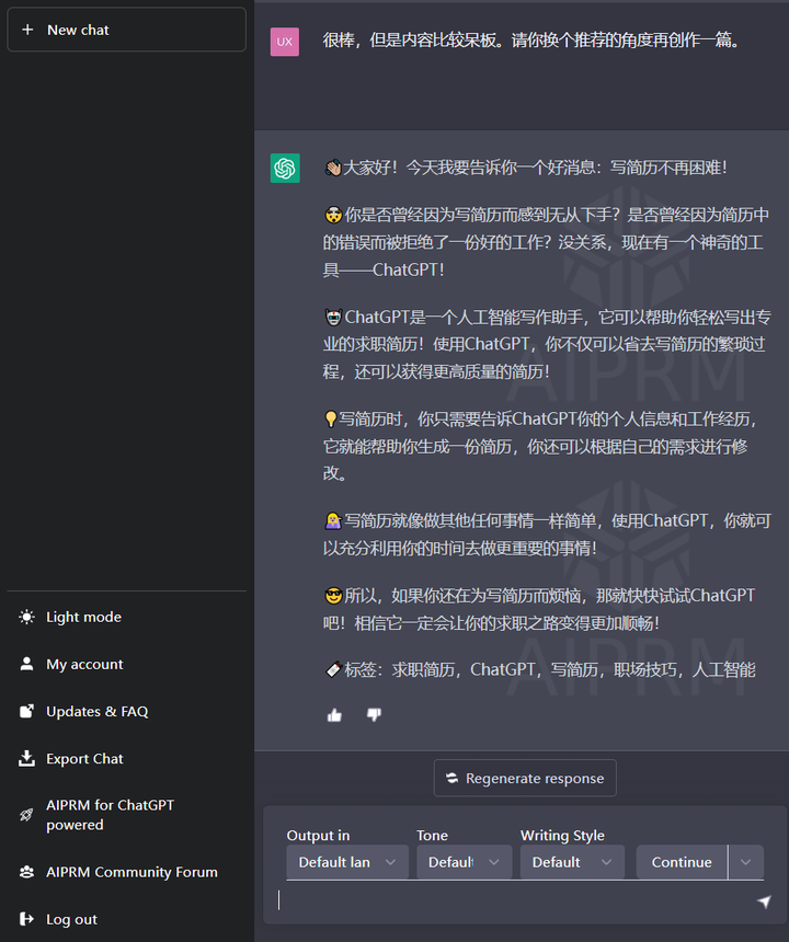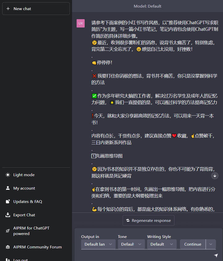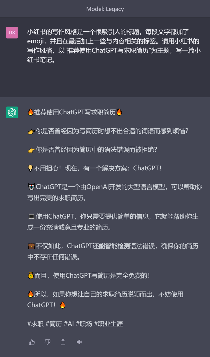 这种模式通常用于生成类似于技术说明书、操作手册等需要明确指令的文本。指令可以是单个句子或多个段落。对于那些已经对小红书笔记风格有所了解的人来说,使用这种形式的提问能够获得更高效的答案反馈。关键词:以小红书的写作风格为灵感,每段文字都加上了表情符号,并在末尾加上了与内容相关的标签。现在让我们用小红书的写作风格,以"推荐使用ChatGPT写求职简历"为主题,来撰写一篇小红书笔记。通过这种关键词模式下的写作,我们能够明显感受到其更具有小红书的风格。