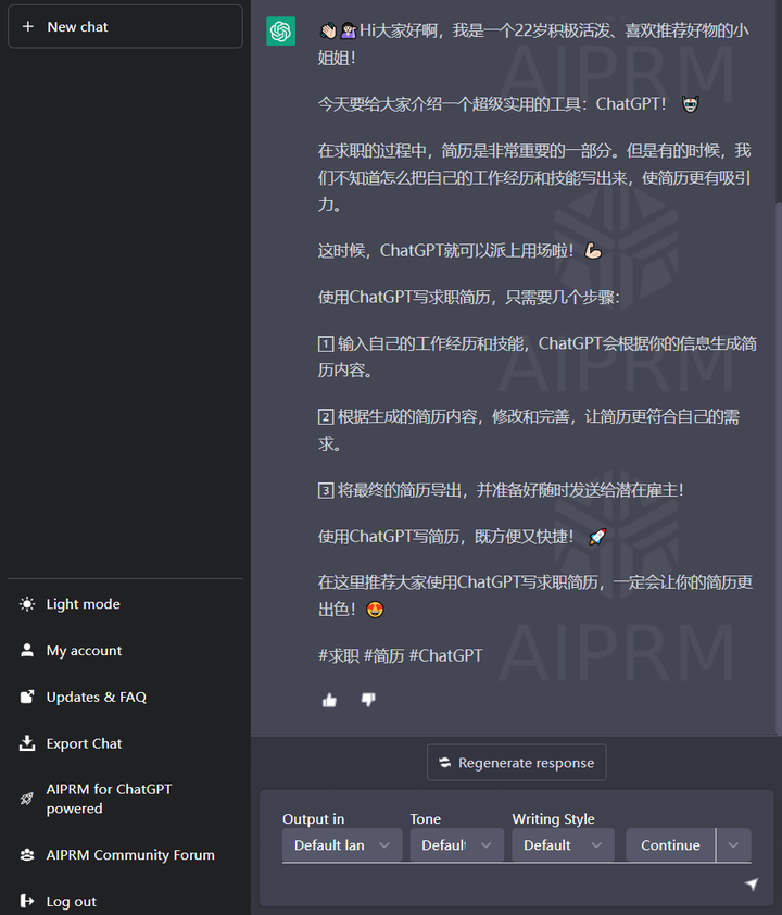 这种模式常用于模拟特定人物的语言风格和语境,在特定情境下生成对话、回答或其他形式的文本。这种模式在我们日常生活中经常被无意中使用,我们可以使用代理模式来利用ChatGPT以我们给定的主题"推荐使用ChatGPT撰写求职简历"进行创作。关键词:小红书的写作风格极具吸引力,每段文字都附带着emoji表情,并在最后添加了一些与内容相关的标签。现在,让我扮演一个积极活泼、喜欢分享教程的22岁姐姐的角色,以小红书的写作风格,以"推荐使用ChatGPT写求职简历"为主题,为你撰写一篇小红书笔记,详细介绍使用ChatGPT撰写求职简历的具体过程。