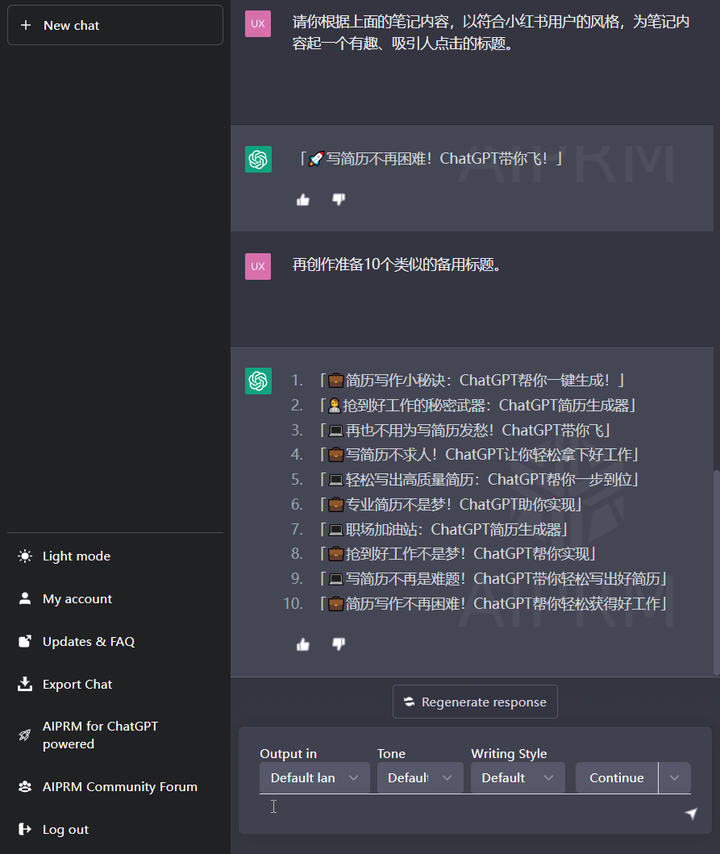 在小红书上,我们可以直接使用这种方法:将我们找到的优秀笔记作为示例展示给ChatGPT,并要求它模仿这些笔记,以给定的主题"推荐使用ChatGPT制作求职简历"进行创作。这种模式要求小红书笔记创作者对热门笔记有一定了解,能够找到适合自己对标的热门笔记。在这种模式下,ChatGPT给出的答案相对效果更佳。