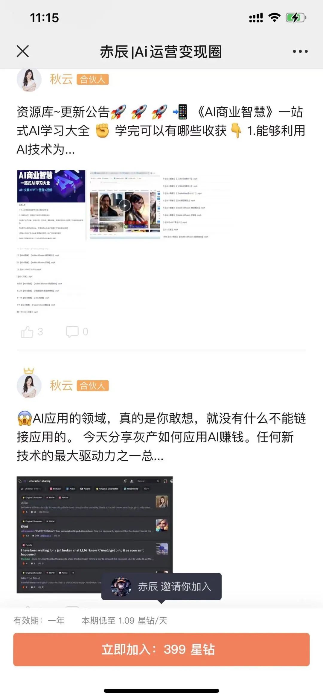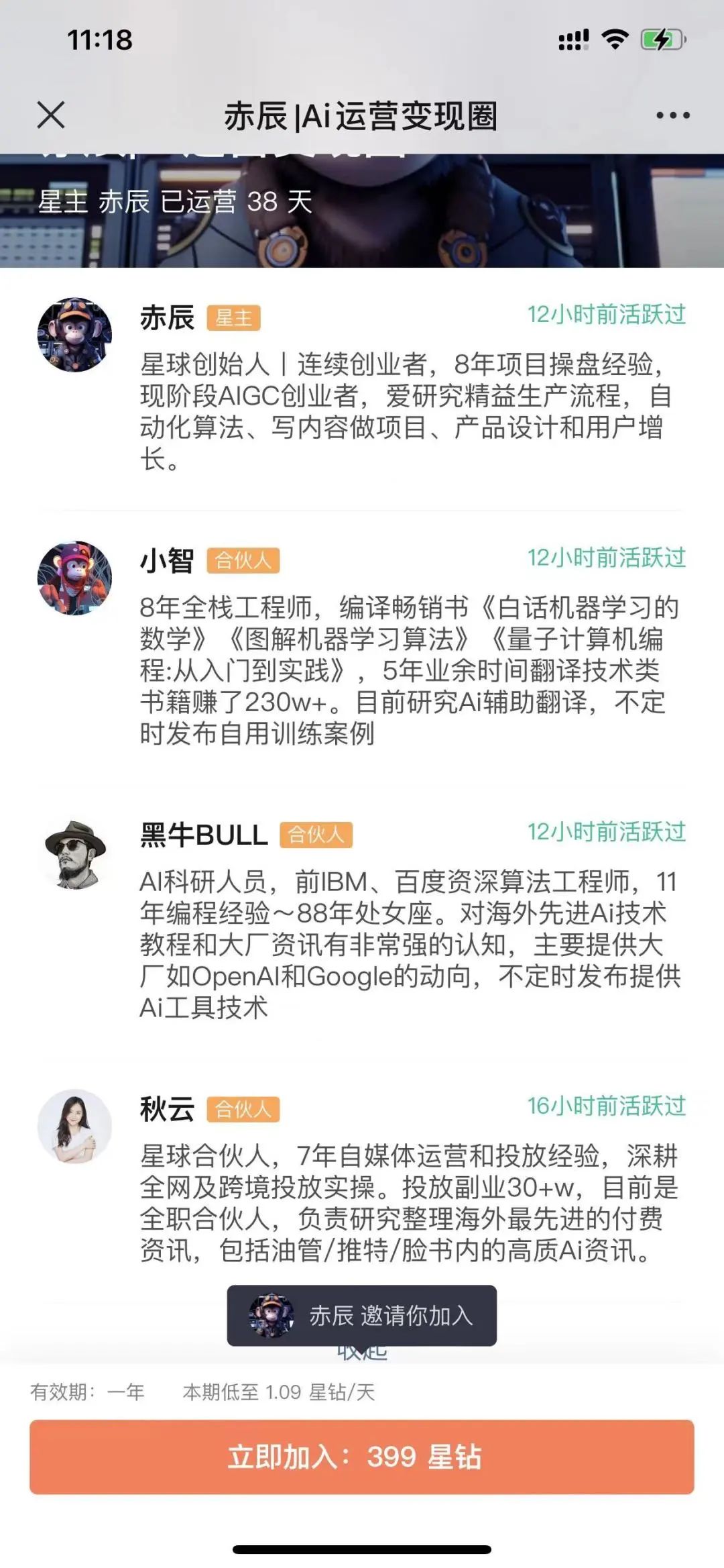 4)前100人!赠送一个刚刚对外发售,初期定价399元/年的【赤辰|Ai运营变现】星球1年,由2名前IBM/百度技术大咖及1名自媒体达人联合创建的星球;现已加入23人,剩77个名额;