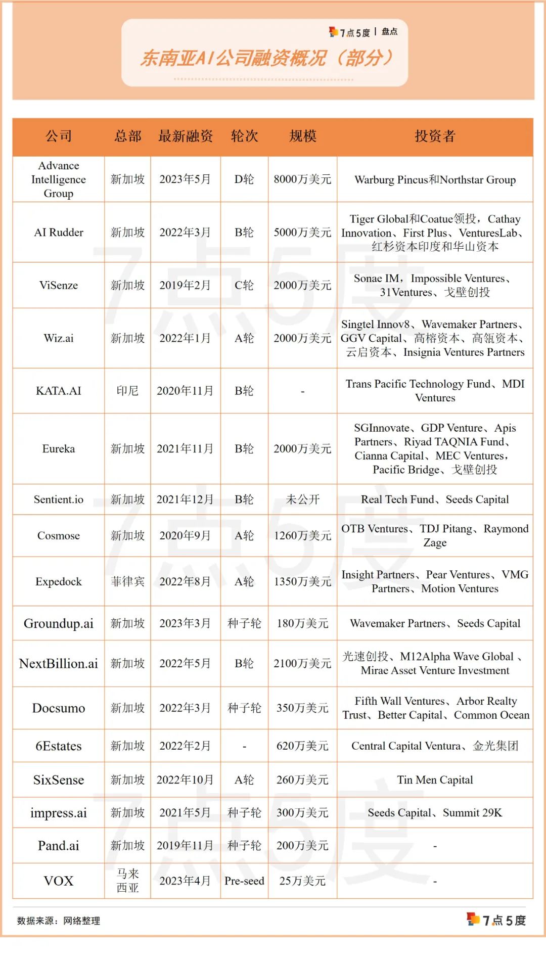 从投资者画像来看,一些知名 VC 和投资集团也活跃在东南亚 AI 创投圈中,比如 Warburg Pincus、Northstar Group、Tiger Global、GGV Capital、高榕资本、高瓴资本、光速创投等。这表明,东南亚 AI 公司也在不断吸引投资者的注意。