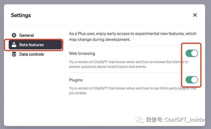 上周OpenAI承诺本周向所有ChatGPT plus用户开放 plugins权限,今天上午我打开ChatGPT就发现ChatGPT的plus版图标变成了紫色,Settings里多了一个Beta features选项。