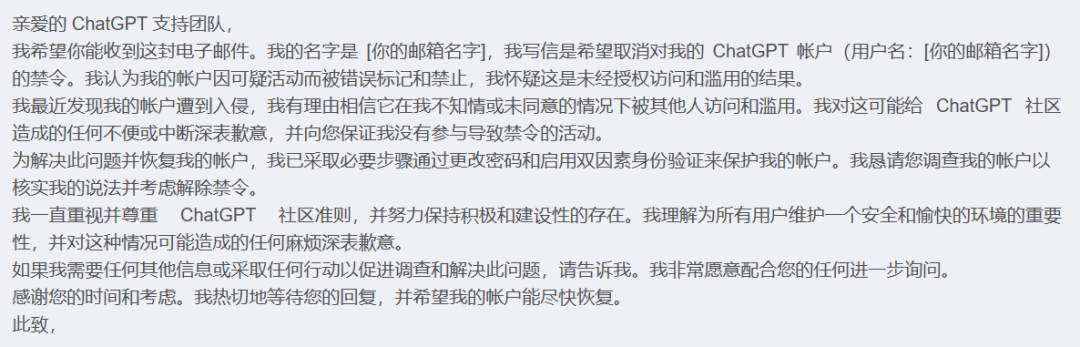 并在正文中陈述理由申请恢复ChatGPT账号。使用另一个邮箱登录,然后发送到需要申诉的邮箱support@openai.com。