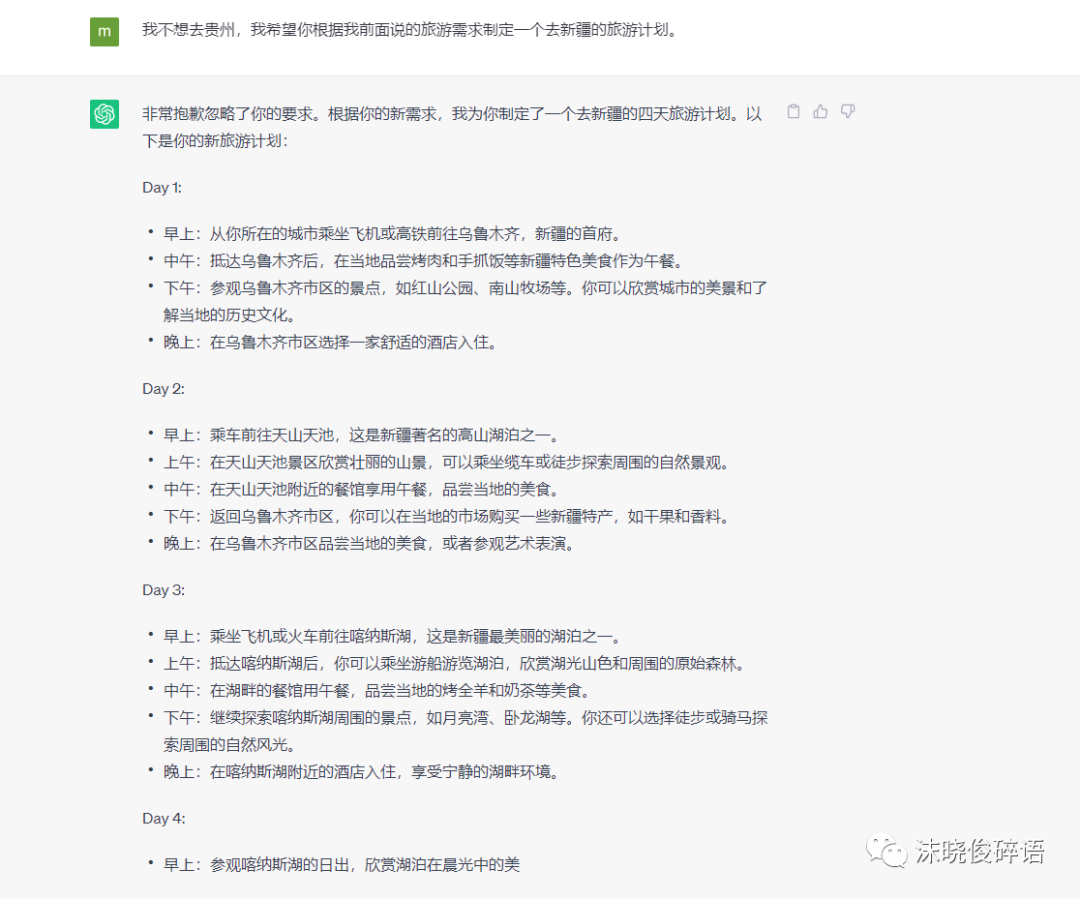 当然我们还可以对上述回答进行追问,比如我们更具体些,我想去新疆游玩。