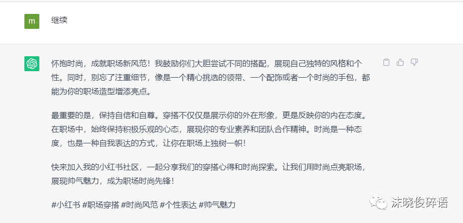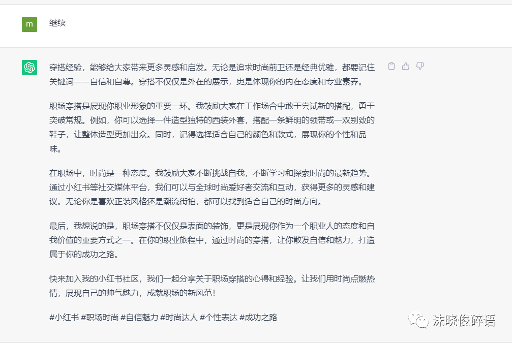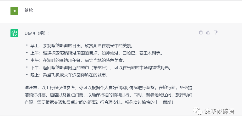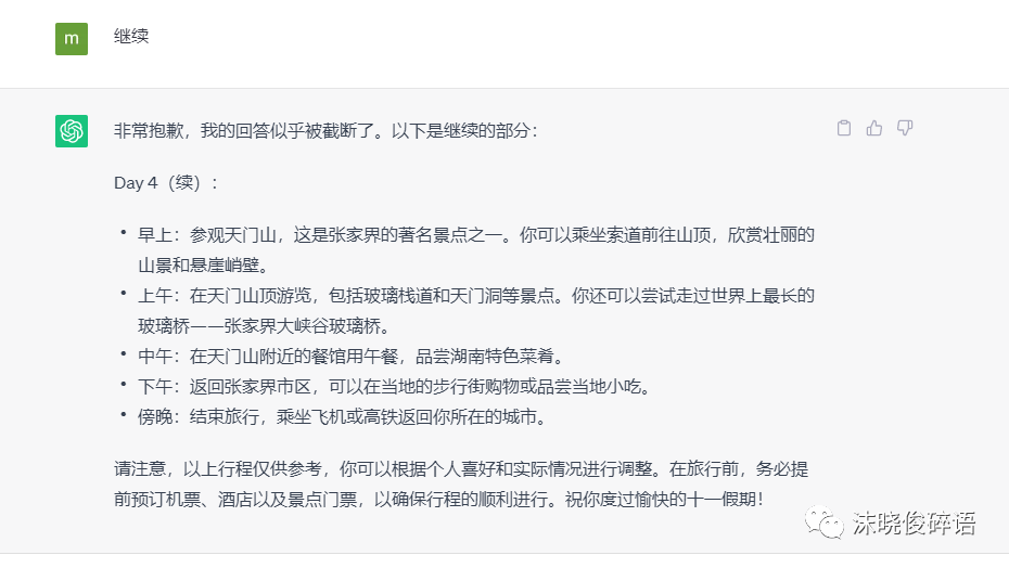 这里有个小细节,我们可以看到由于字符篇幅过长,出现了中断现象,那这里我用了继续,他就会续上前面的话题继续输出。