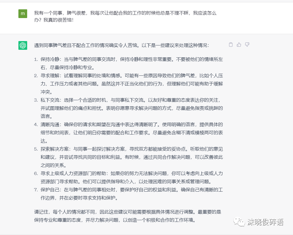 比如我们可以这样提问:我有一个同事,脾气很差,我每次让他配合我的工作的时候他总是不理不睬,我应该怎么办?我真的很苦恼!