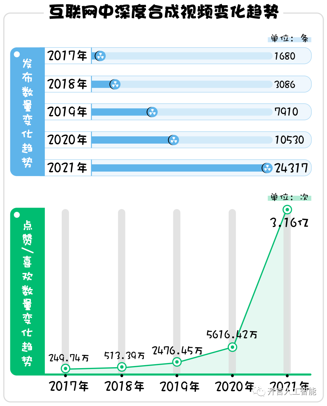 2016年,AlphaGo成为了第一个击败围棋世界冠军的人工智能机器人,深度学习的威力开始显现。自那以后,深度合成技术得到了广泛应用。以深度合成视频为例,近几年互联网中深度合成视频的发布和传播数量呈快速增长态势。根据清华大学人工智能研究院联合多家单位发布的《深度合成十大趋势报告(2022)》,深度合成技术正在快速发展,并将成为未来十年最具潜力的技术之一。