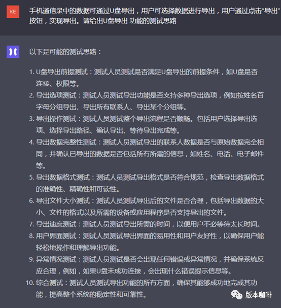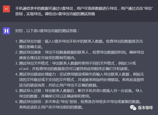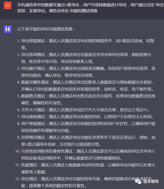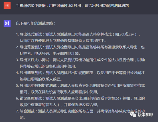 小A一看,ChatGPT给出了7个点,好像是那么回事,但不满意。因为小A觉得有些重要的点它没给出,例如导出数据的正确性检查,但你又会发现它给出的第6点“错误处理测试”,也好像包含了导出数据的检查,只是有些含糊。