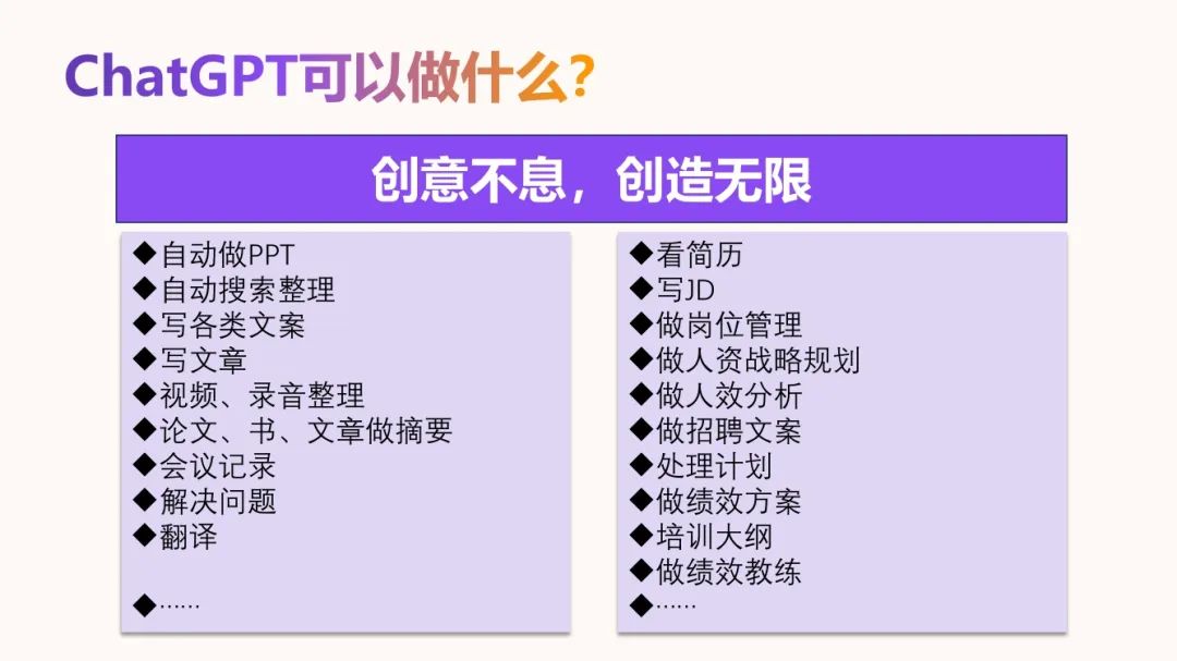 另外,就在今年五一,美国的IBM全球裁员了7000个职位,这些职位全部由人工智能AI来代替。虽然,在未来3到5年内,ChatGPT不会取代HR,但未学习和不使用ChatGPT的HR将面临被淘汰的风险。