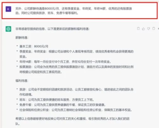 我再给ChatGPT提供一些信息。我告诉它这个岗位的薪酬待遇,例如基本工资、季度奖金、年终奖、年终14薪以及股票奖励。