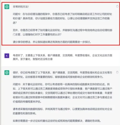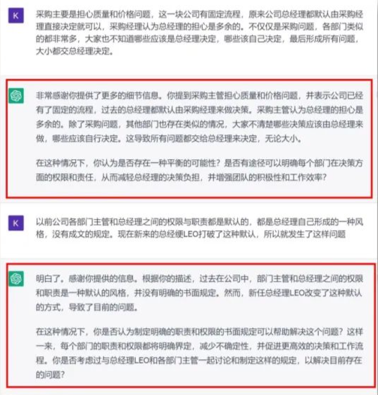 ChatGPT只用了13个问题,就帮助HR经理找到了问题的核心,即权力和责任的分配缺乏明确的书面规定。这展示了ChatGPT在解决复杂问题和提供解决方案方面的价值。