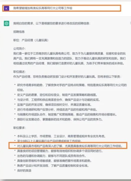 比如,我告诉ChatGPT我需要招聘一个产品经理来推动研发部门设计开发更好的儿童玩具。请根据市场上的岗位类型,帮我撰写一份完整的招聘信息,以便在专业招聘网站上发布。