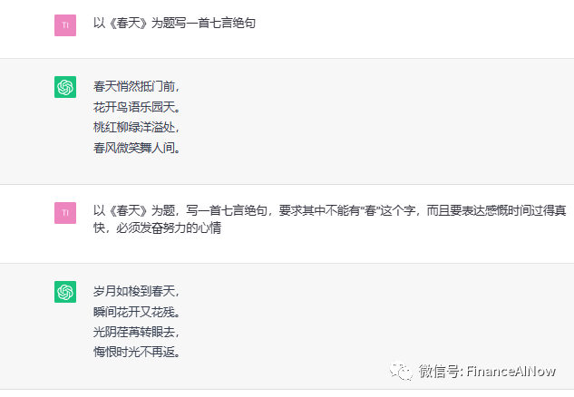 你觉得字词还可以,但是意境似乎比较单薄。于是你提出进一步的要求:“以《春天》为题,写一首七言绝句,要求其中不能有“春”这个字,而且要表达感慨时间过得真快,必须发奋努力的心情。”—