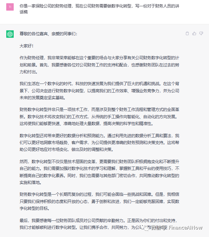 但如果你把局面说得细一点,给GPT提供更具体的要求,它就会做得更好。比如你说“你是一家保险公司的财务经理,现在公司财务需要做数字化转型,写一份对于财务人员的讲话稿”,它生成的内容就不一样了