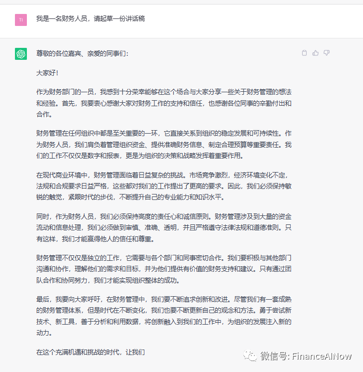 举个例子,假设你是一名财务人员,你让GPT给写个发言稿。如果只是简单地说“我是一名财务人员,请起草一份讲话稿”,它生成的就是一份讲话稿。不一定符合你需要的主题。