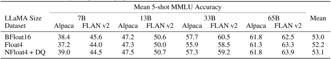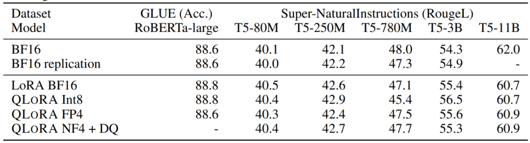 表 3:在 GLUE 和 Super-NaturalInstructions 上比较 16 位 BrainFloat (BF16)、8 位整数 (Int8)、4 位浮点数 (FP4) 和 4 位 NormalFloat (NF4) 的实验。QLoRA 复制 16 位 LoRA 和 fullfinetuning。