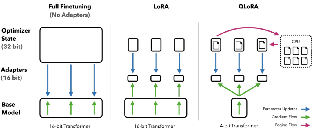 图 1:不同的微调方法及其内存要求。QLoRA 通过将 transformer 模型量化为 4 位精度并使用分页优化器来处理内存峰值提升了性能。