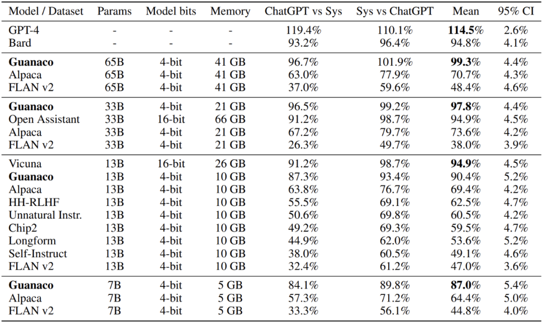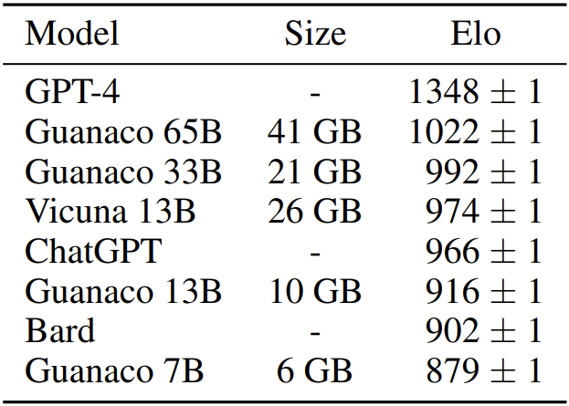 表 1. 模型之间竞争的 Elo 评级,以 GPT-4 为标杆,GPT4 之后 Guanaco 33B 和 65B 获胜次数最多,而 Guanaco 13B 的得分比 Bard 好。