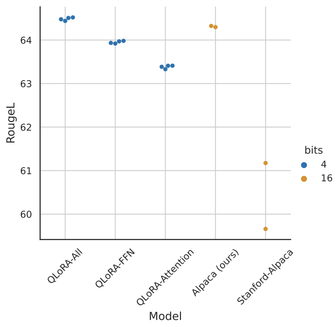 QLoRA 的效率让我们能够在模型规模上对指令微调和聊天机器人性能进行深入研究,此前由于内存开销的限制,使用常规微调是不可能的。