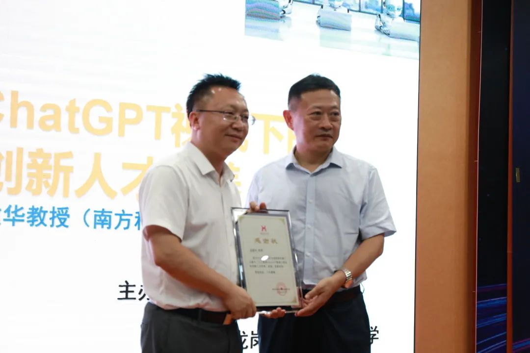 赵建华教授讲座结束后,我校毛展煜校长进行了发言。他首先代表学校对赵教授的莅临表示感谢,接着他谈到了自己使用相关人工智能技术的体验以及当下我国存在的核心技术卡脖子的问题,他鼓励同学们好好学习,积极投身到科技报国中去。最后毛展煜校长还为赵教授颁发感谢状,感谢他带来了精彩的讲座。