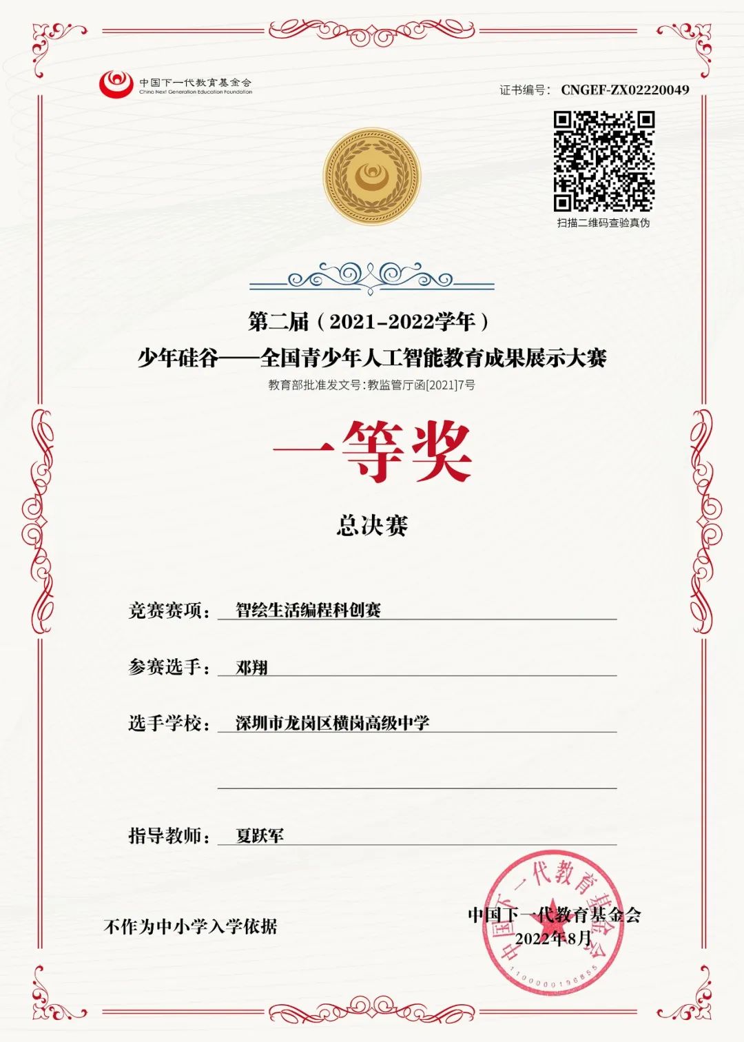学生载誉无数,曾获第二届全国青少年人工智能教育成果展示大赛唯一金奖,首届深港澳青少年创意设计大赛铜奖等,并成功入围第九届中国“互联网+” 大学生创新创业大赛萌芽赛道省赛选拔赛。