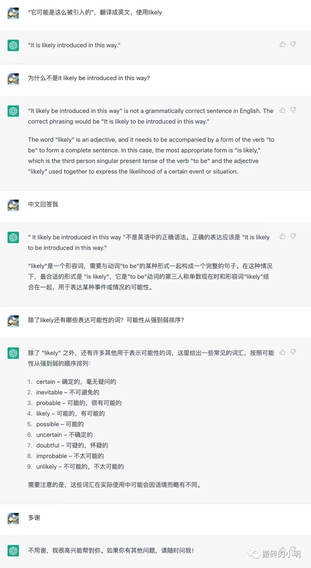 学英语的时候会学很多语法但是记不住,我平时主要还是靠语感,有时候一些表达总觉得不对。比如下面这个句子”它可能是这么被引入的“,我自己用likely来翻译,感觉读起来不顺口,这时可以让ChatGPT帮我纠正语法错误,还可以给我解释原因。