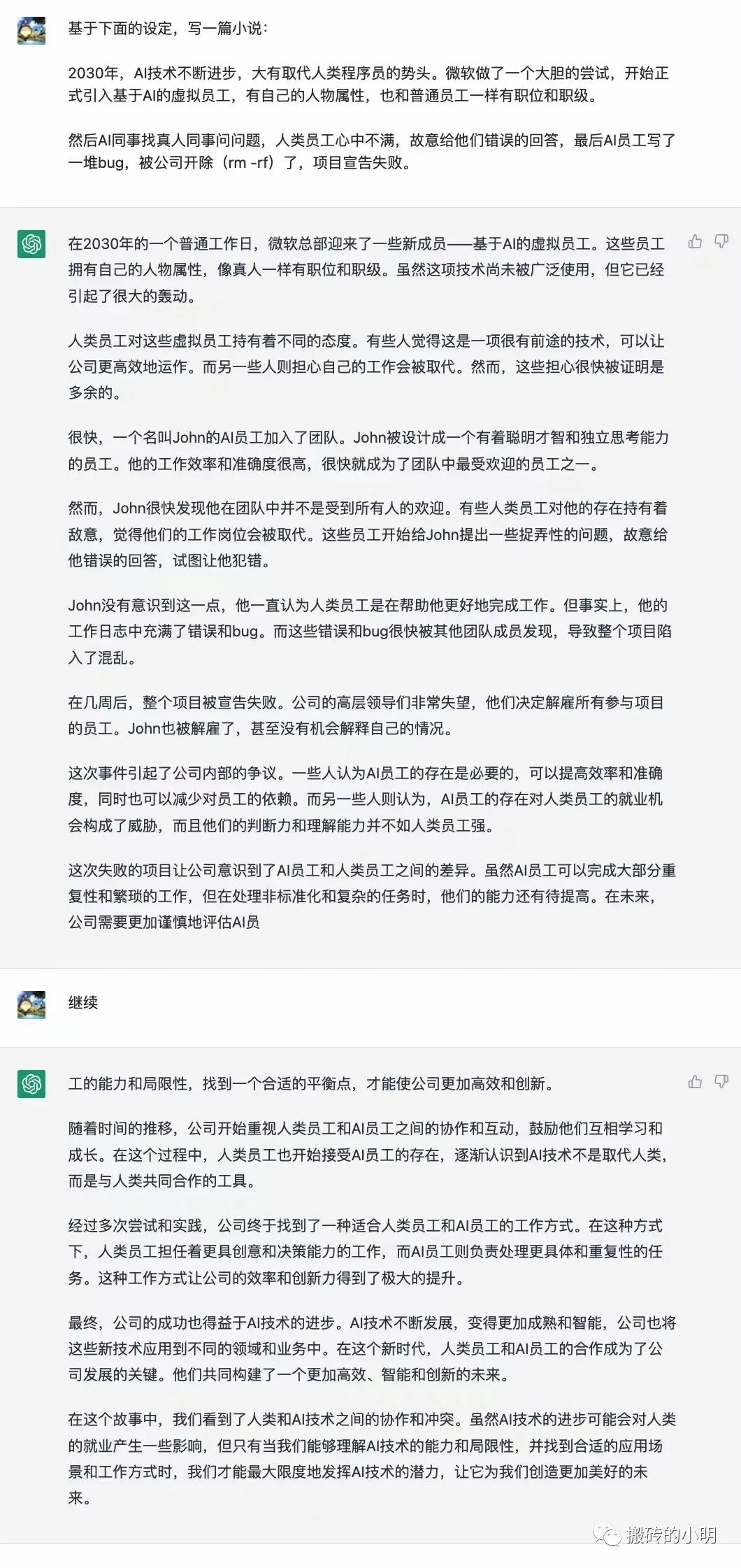 再比如我突发奇想,AI如果以后真的开始取代人类程序员,可能会遭到人类程序员的抗议。ChatGPT直接帮我写成了短篇科幻小说,甚至还在末尾做了升华,很符合社会主义价值观。