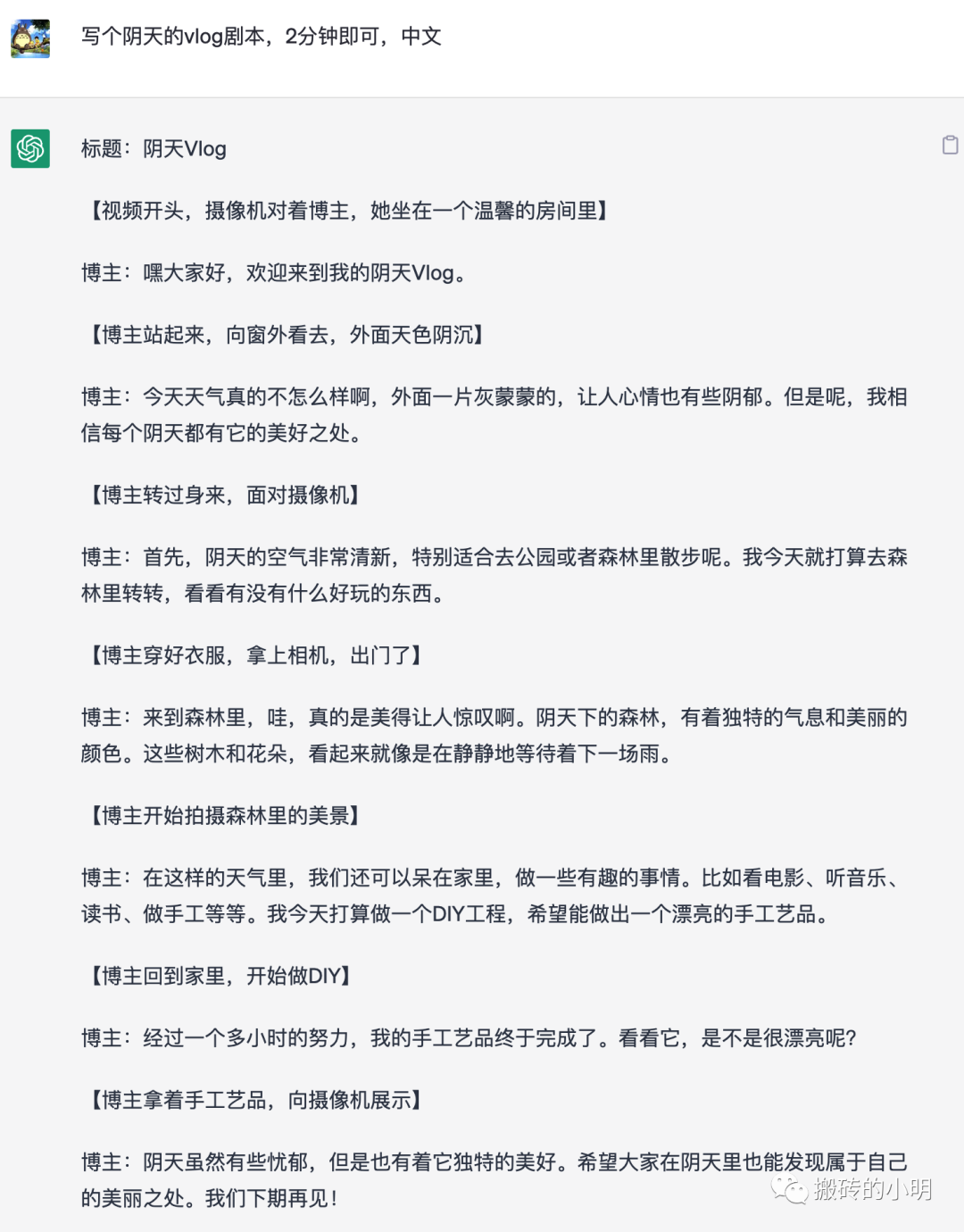 爱好Vlog的朋友还可以让ChatGPT写剧本。