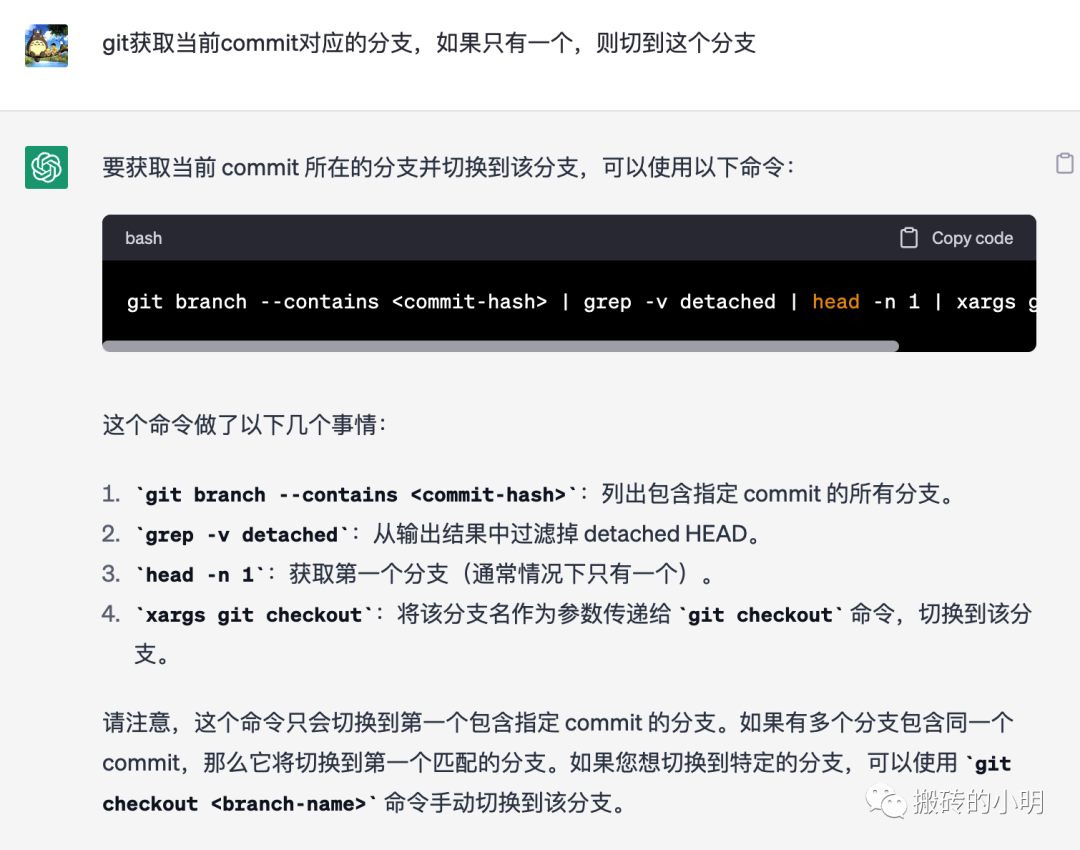经常需要写点bash帮我实现一些功能,但是bash命令实在太多了根本记不住,这个时候用ChatGPT就会很有帮助了,不过它写出来的也不一定完全符合要求,但是复制粘贴改改就能用了,节省了很多查资料的时间。