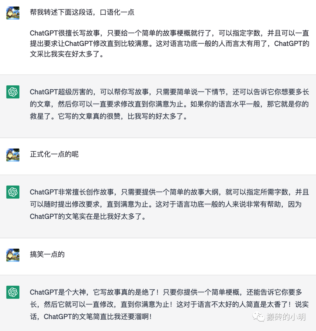 ChatGPT可以轻松的从一大段文字中提炼关键点,把简单的几句话扩展成一整篇文章,或是把文字用不同方式转述出来。