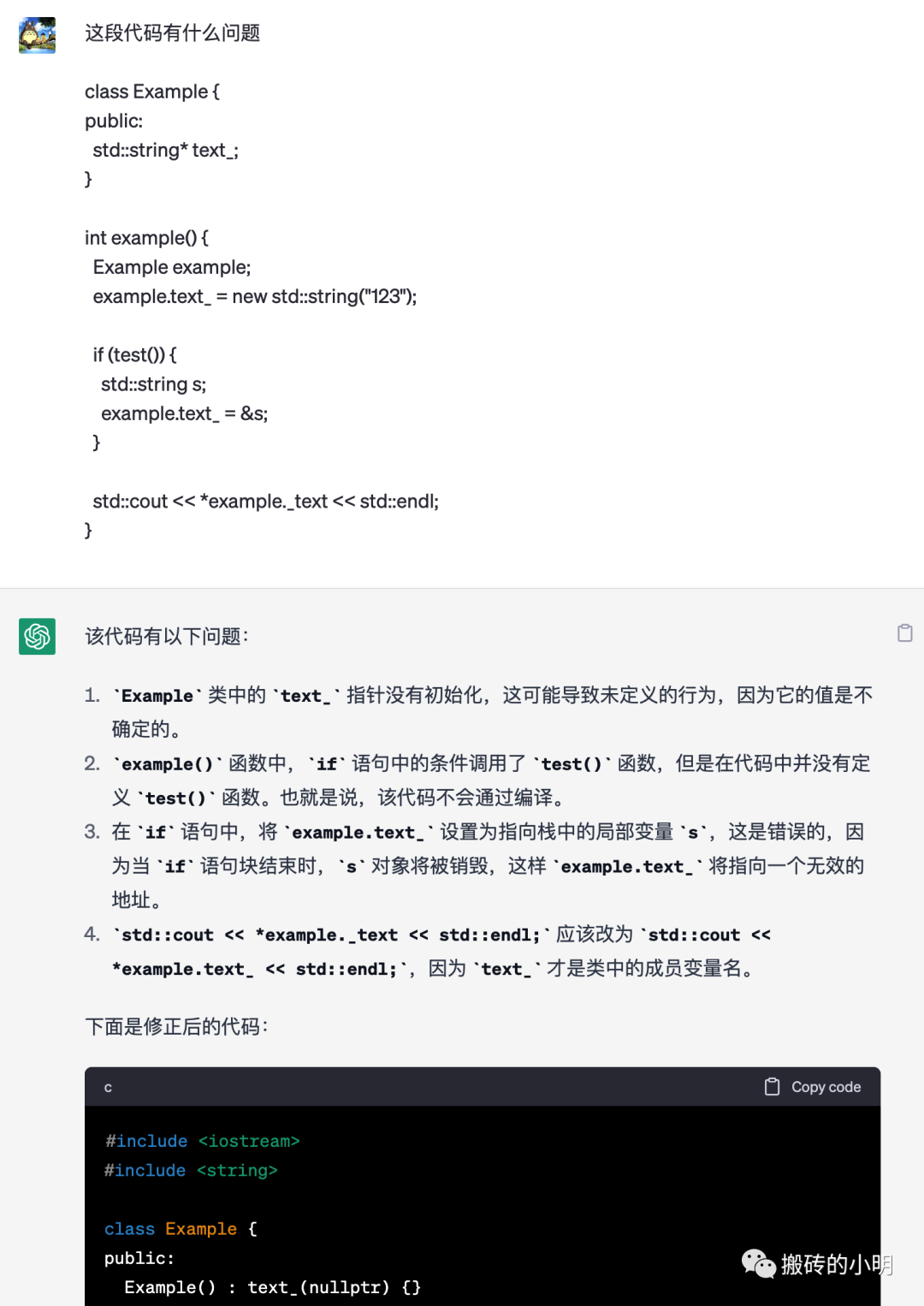 随便发一段代码给ChatGPT,就能给你找到各种Bug,还会给你修正后的结果。
