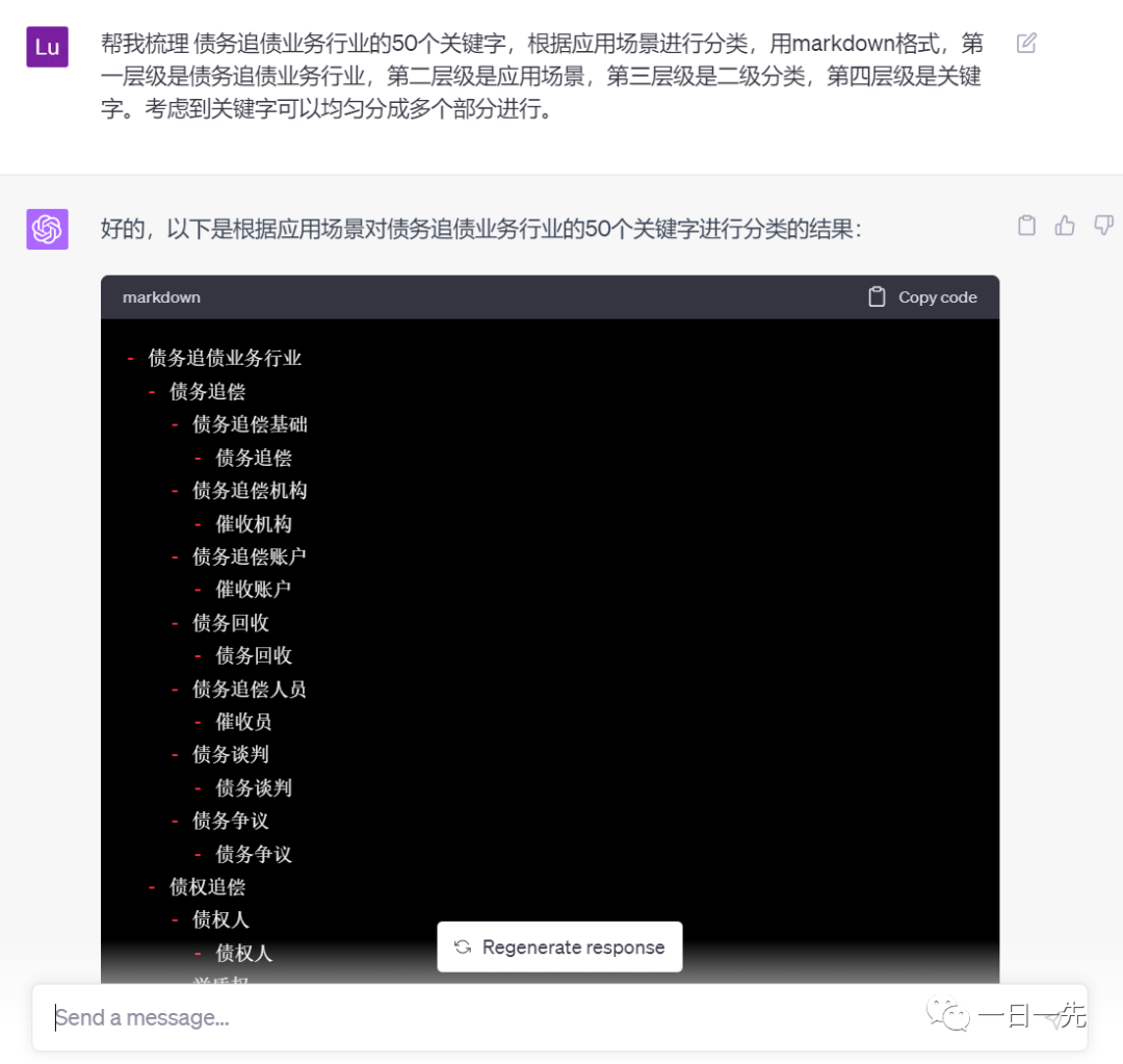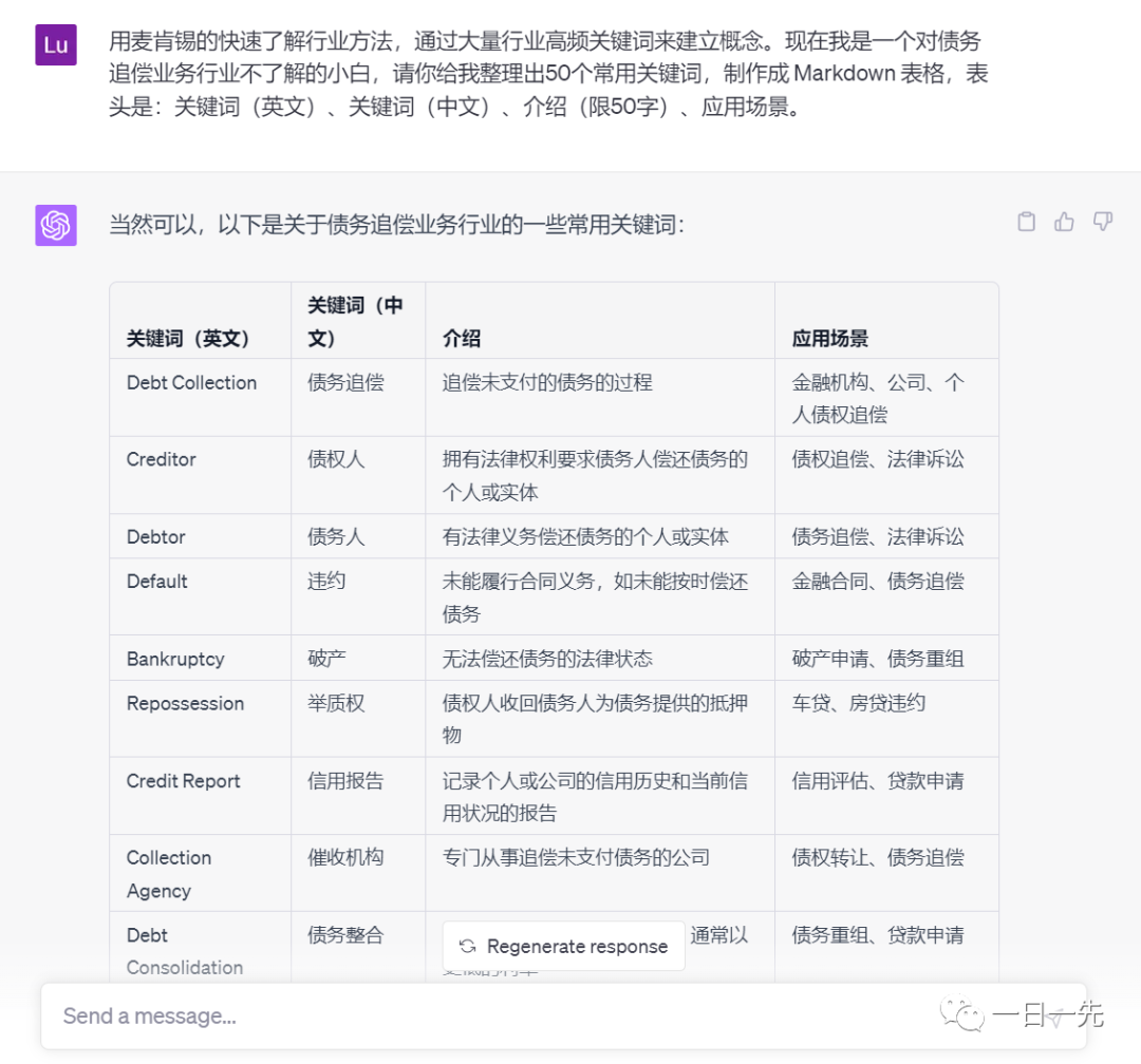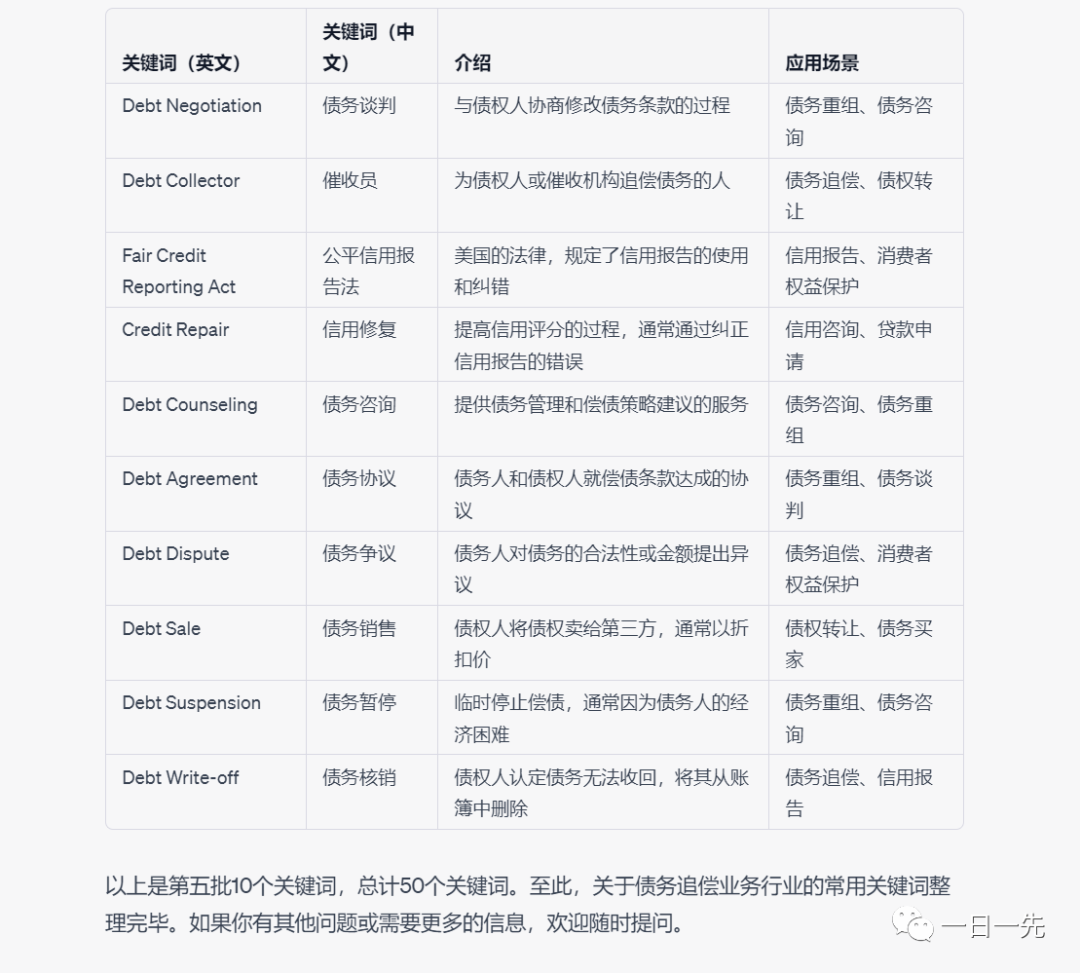 掌握行业概况主要包括五个步骤,这些环节相互关联,有助于你逐步深化对行业的认知。我们将从最基本的“行业100个关键字”这一步开始探讨。借助ChatGPT获取行业100个关键字的方式十分简便。在下面的示例中,我将以"债务追债业务行业"为例,为了便于演示,将关键词数量限制为50个。