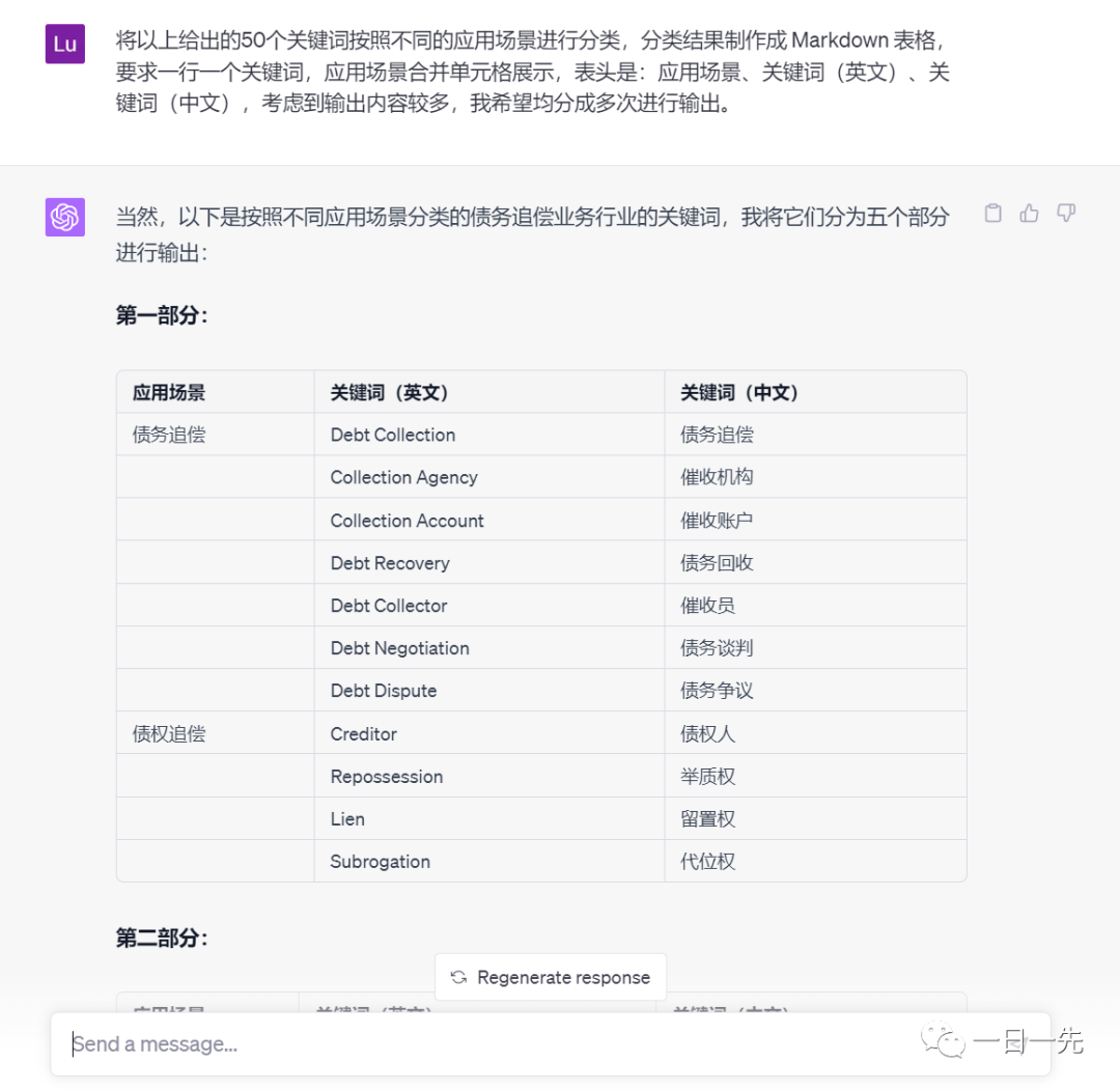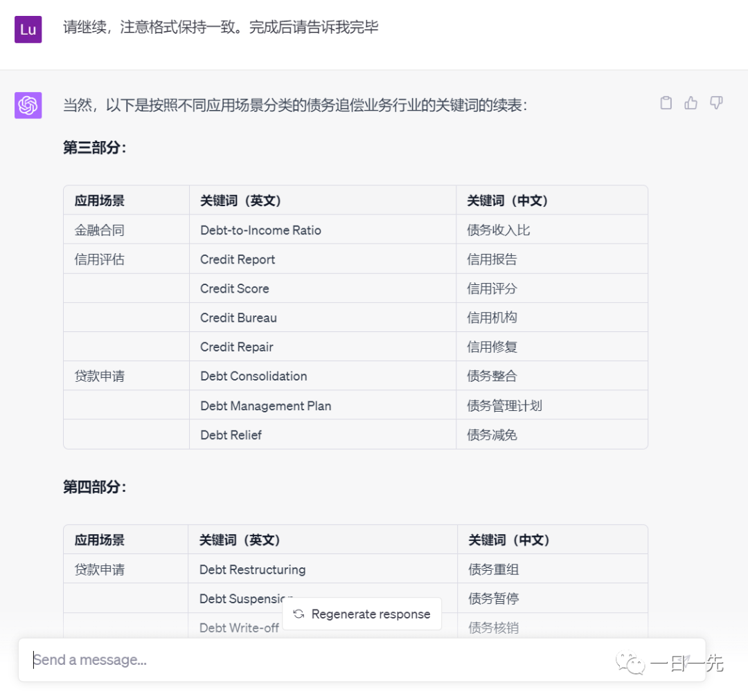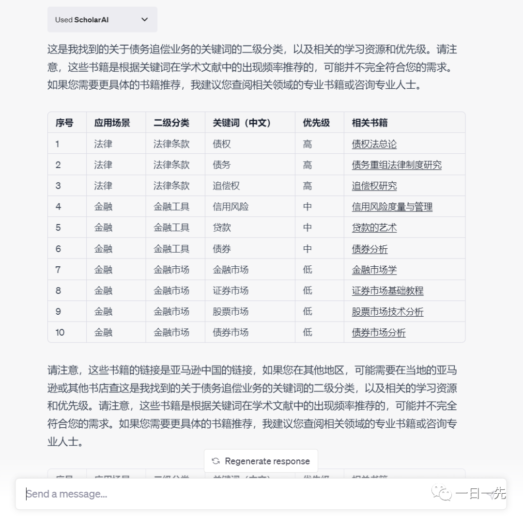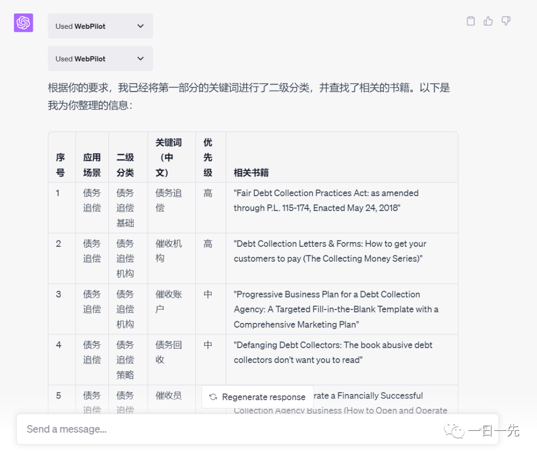 在获取了关键词分类表之后,我们对债务追偿业务行业已经有了一个大体的认知框架。下一步,就是深入了解如何学习这些关键词所代表的行业知识。于是,我们进一步要求ChatGPT从一个行业新手的角度出发,对之前分类的场景进行二次分类,并为每个关键词设定学习优先级和提供相关书籍资料,这样我们就可以根据自身需求梳理出该行业的学习路径。由于生成式模型有时候可能会出现编造内容的情况,因此在要求ChatGPT提供参考文献时,必须加上"引用真实数据"的说明,否则你可能找不到它给出的参考文献和书籍。如果你是在联网的环境下使用,可以尝试要求输出中文文献。需要注意的是,我发现了一个插件的小bug,那就是ChatGPT会基于插件搜索结果,反复输出表格。另外,尽管强调要引用真实数据,但输出的书籍链接仍然可能是虚假的。