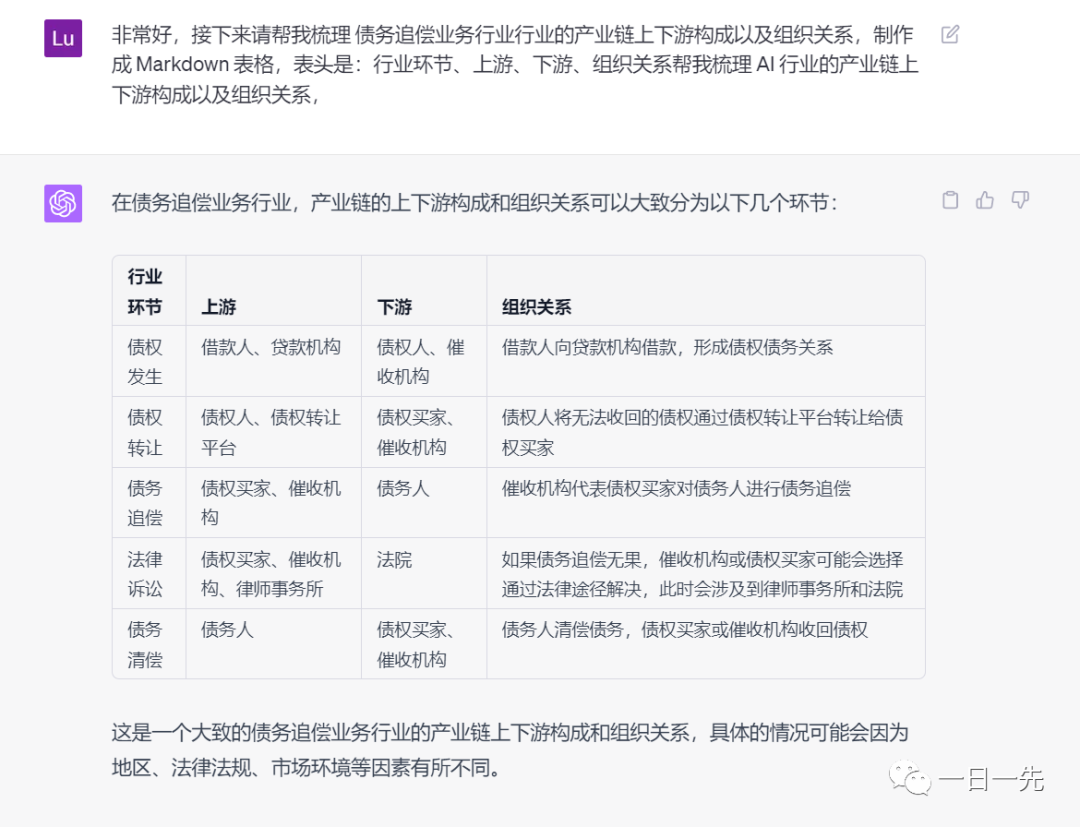 在我们对债务追偿业务行业的核心词汇及其基本学习路线有了初步理解之后,接下来我们可以利用AI的力量,进一步深入探索该行业的宏观视角。例如,我们可以请求ChatGPT为我们描绘债务追偿业务行业的整体产业链,以及其上下游的相关组织关系。在这个步骤中,我们只需要简洁明了地向ChatGPT提出我们的需求,那么它就能为我们呈现一个精简而直观的行业产业链概览。