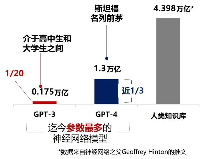 至今,GPT-3训练模型为1750亿( 0.175万亿),介于高中生和大学生之间,GPT-4训练模型为 1.3万亿,可在斯坦福等名校位列前茅,距离人类知识库4.398万亿神经模型尚有差距。