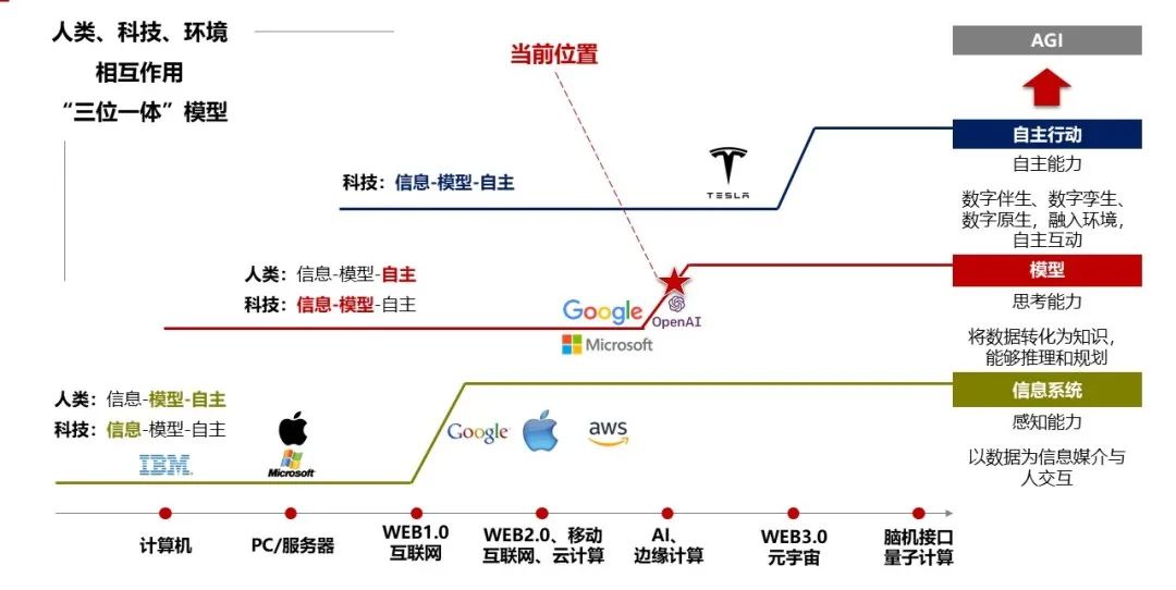 在数字化自主化阶段是多模型生态,新领域、新专业、新结构、新场景、新适应能力,一起形成闭环,GPT类似基因,以进化的力量不断加强认知和推理能力,各类超想象AGI层出不穷。