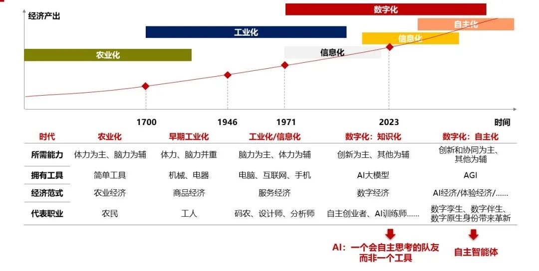 16世纪科学革命后,人类从工作化、信息化走向数字化,GPT和AGI预示着数字化的两个阶段,一是当前已经进入的数字化知识化阶段,所需能力是“创新为主,其他为辅”,拥有的工具是GPT大模型,经济范式是数字经济;二是未来是数字化自主化阶段,所需能力是“创新和协同为主,其他为辅”, 拥有的工具是AGI,经济范式是更深层次的数字经济,暨AI经济、体验经济等。