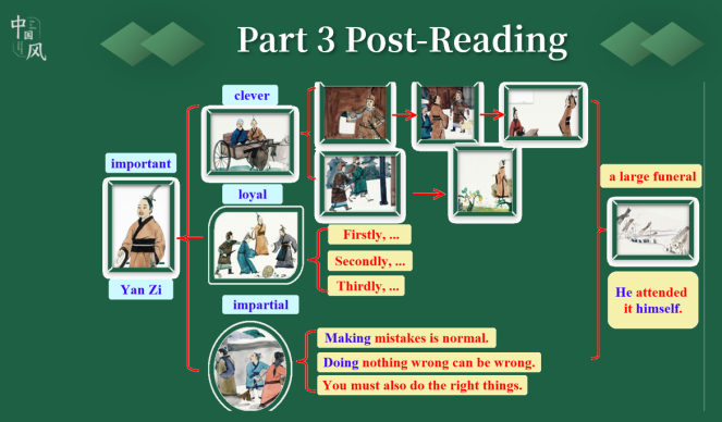 “应用实践”——我们不仅可以利用阅读策略,提取故事情节中的晏子的人物特性,再用思维导图和可视化图表,复述晏子的故事,引发学生的思考。