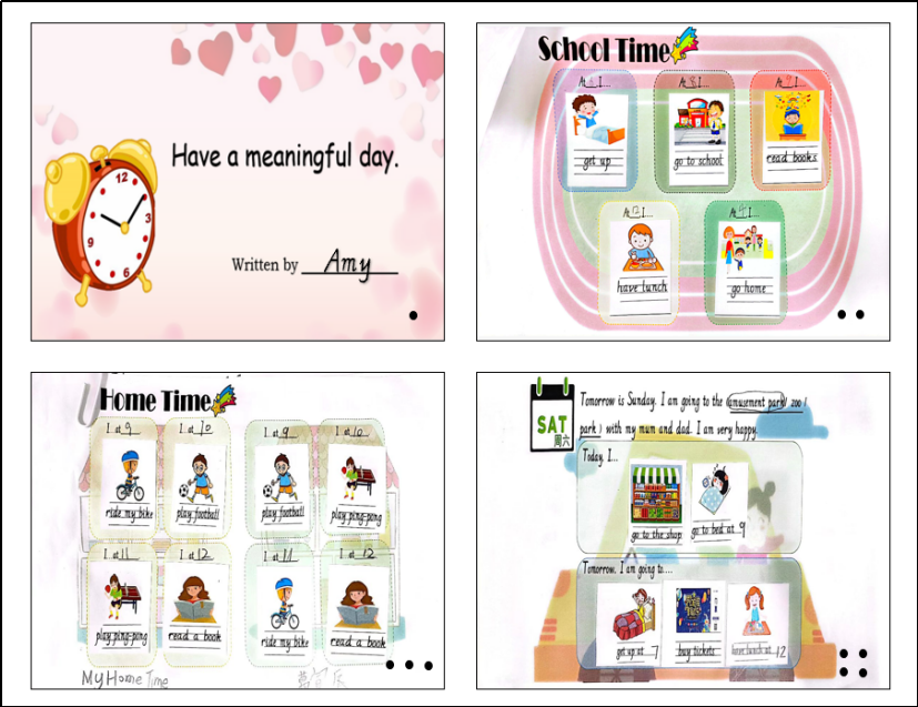 多思考几步,英语教学就从碎片化的时间表达方式记忆,变成了主动关注生活的发现任务,还培养了“专时专用”的时间观,最后再回到生活中,策划自己的游玩活动并做成一本小绘本书。