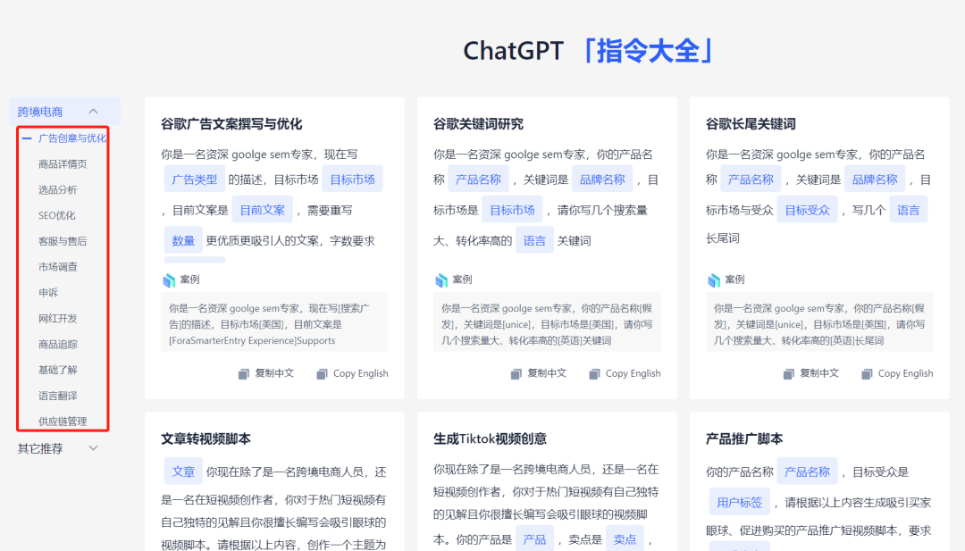 这份跨境ChatGPT指令大全不仅涵盖了SEO优化,还有跨境广告创意与优化、商品详情页、选品分析、、客服与售后、市场调研、账户申诉、网红开发、商品追踪、语言翻译和供应链管理等方面。掌握这些AI指令将大大提高你的运营能力和效率。