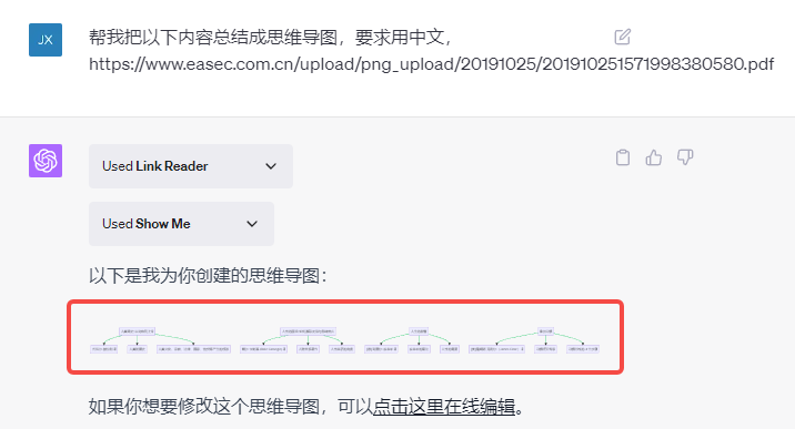 有的书籍内容太长,而你又想很快get到核心内容,咋办呢,丢给ChatGPT吧,它先使用Link Reader插件读取PDF内容,然后使用Show Me插件生成了思维导图,能快速帮你总结出书里的重点知识。