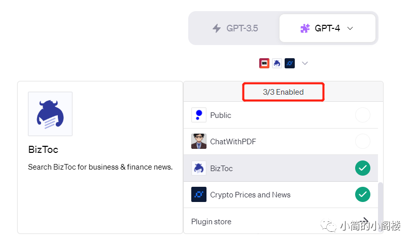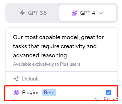 如上图所示,GPT3.5目前只保留了一个版本,GPT-4在选择下会有2个版本,一个默认Defult版本,一个就是我们想要使用的plugins版本。