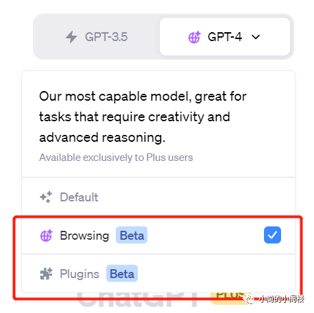 在主界面选择GPT-4,在下拉框这里即可选择Browsing或者Plugins版本。