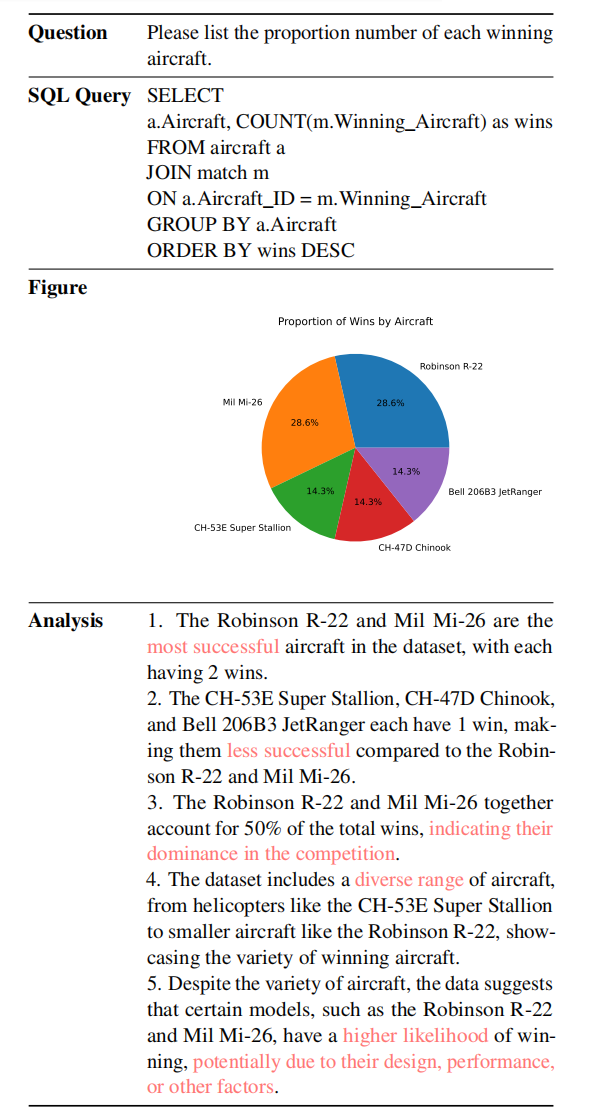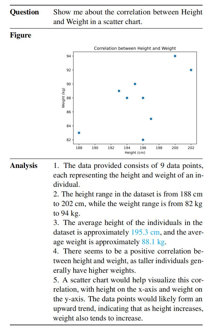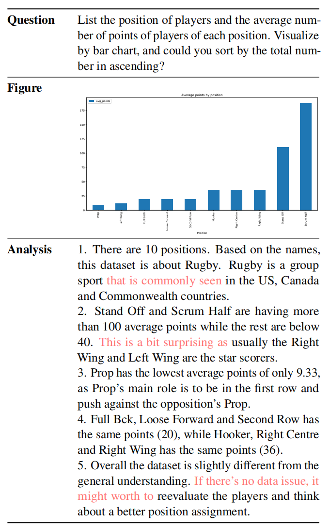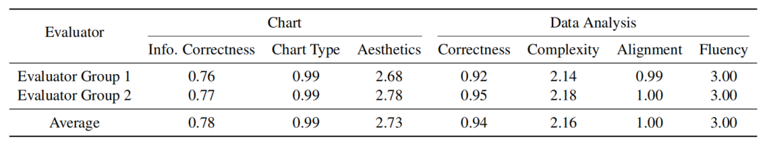 根据上表,GPT-4生成的图表在信息准确度方面表现不佳,平均得分只有0.78;但在图表类型选择方面表现优异,正确率达到99%;图表的美观程度一般。GPT-4的分析结果在正确性方面较高,平均有94%的内容是正确的,而且与问题相关性较好;但分析的复杂度和流畅度都不高。