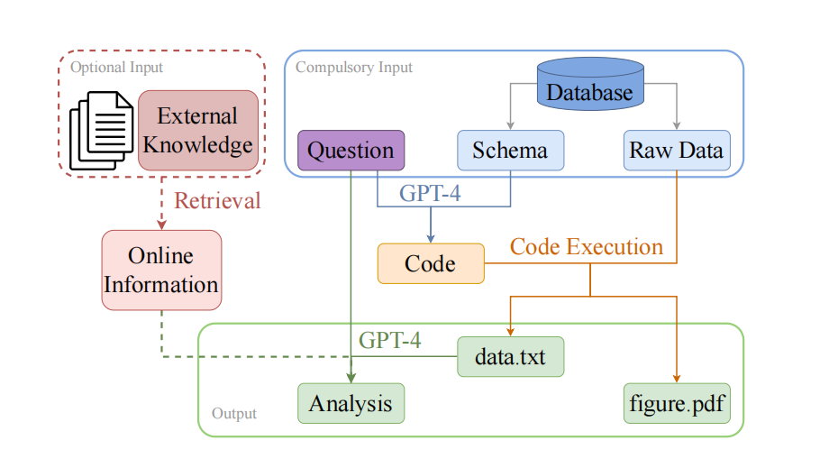 此图中业务问题和数据库的必填信息如右上蓝色框所示。参考外部知识源的可选输入在左上角的红色虚线框中圈出。包括提取数据、数据可视化和分析在内的输出在底部的绿色框中圈出。