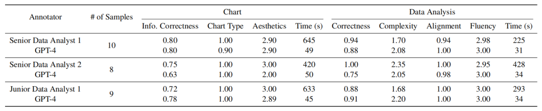 数据来源:研究者们选择了NvBench数据集从不同领域随机选择100个6种不同图表类型和4种不同难度级别的问题进行实验。再分别让GPT-4和2位高级分析师和1位初级分析师去做这个任务,以得到任务结果数据。